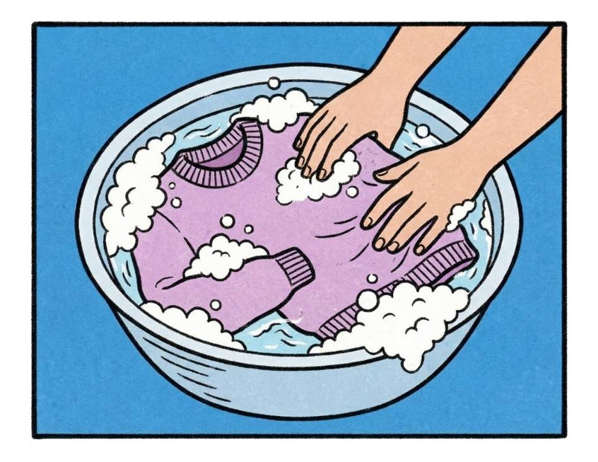 When a wash is finally needed, gently hand wash in cool water and mild wool detergent. Never wring or twist. To dry, lay the wet garment flat on a clean towel, roll it up to absorb excess moisture, and reshape to dry flat.